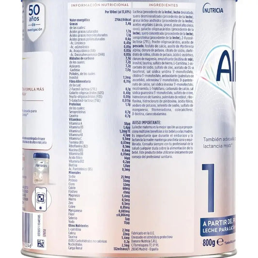 Almirón Profutura 1 contains: Lactose (from MILK), vegetable oils (palm, coconut, canola, high oleic sunflower, sunflower), skimmed MILK, demineralised whey (from MILK), galacto-oligosaccharides (from MILK), whey concentrate (from MILK), whey protein (from MILK), fructo-oligosaccharides, FISH oil (from FISH), whey protein (from MILK), fructo-oligosaccharides (from FISH).FISH oil, calcium phosphate, Mortierella alpina oil, potassium citrate, choline chloride, potassium chloride, magnesium chloride, sodium citrate, sodium citrate, L-ascorbic acid, L-ascorbic acid, sodium chloride, sodium chloride, sodium chloride, sodium chloride, sodium chloride, sodium chloride, sodium chloride, sodium chloride.sodium citrate, L-ascorbic acid, sodium chloride, emulsifier (SOYA lecithin), inositol, taurine, iron sulphate, L-carnitine, sodium L-ascorbate, zinc sulphate, sodium salt of uridine 5-ascorbate, zinc sulphate, sodium salt of uridine 5-ascorbate.5-monophosphate, cytidine 5-monophosphate, DL-alpha-tocopherol acetate, antioxidant (ascorbyl palmitate), adenosine 5-monophosphate, calcium D-pantothenate, inosine 5-monophosphate, calcium D-pantothenate, inosine 5-monophosphate salt, inosine 5-monophosphate salt, inosine 5-monophosphate salt, inosine 5-monophosphate salt.inosine 5-monophosphate, nicotinamide, magnesium hydrogen phosphate, L-tryptophan, calcium carbonate, inosine 5-monophosphate salt, magnesium hydrogen phosphate, L-tryptophan, calcium carbonate, guanosine 5-monophosphate salt.5-monophosphate, copper sulphate, DL-alpha-tocopherol, retinyl palmitate, thiamine hydrochloride, riboflavin, pyridoxine hydrochloride, folic acid, potassium iodide, sodium selenite, phytomenadione, manganese sulphate, cholecalciferol, D-biotin, cyanocobalamin.