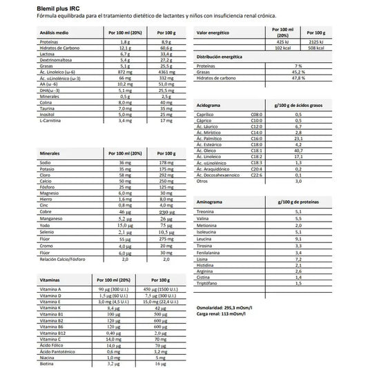 Nutritional values of Enfamil A.R. per 100 g: Energy 510 kcal; Fat 26 g; Saturated fatty acids 10 g; Linoleic acid 45020 g; Α-linolenic acid 370 mg; Carbohydrates: 56 g; Sugars 30 g; Protein 45150 g; Salt 0.42 g; Vitamin A 460 pg; Vitamin D 45145 pg; Vitamin E 45144 mg; Vitamin K 41 pg; Vitamin C 87 mg; Thiamine 0.41 mg; Riboflavin 0.92 mg; Niacin (NE) 44931 mg; Vitamin B6 0.31 mg; Folic acid 82 pg; Vitamin B12 1.53 pg; Biotin 45000 pg; Pantothenic acid 45079 mg; Sodium 168 mg; Potassium 560 mg; Chloride 410 mg; Calcium 590 mg; Phosphorus 330 mg; Magnesium 41 mg; Iron 45082 mg; Zinc 44931 mg; Copper 0.33 mg; manganese 0.078 mg; selenium 44999 pg; iodine 87 pg; osmolarity 220 mOsm/l; arachidonic acid (ARA) 173 mg; docosahexaenoic acid (DHA) 87 mg; choline 122 mg; inositol 31 mg; L-carnitine 44969 mg; taurine 31 mg; nucleotides 20 mg.