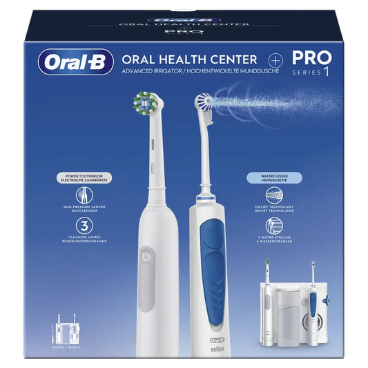 Cleans deep between the teeth and purifies below the gum line. The 5 water pressure modes offer you a unique cleaning experience. Choose from 4 water jets to achieve the most suitable cleaning. A professional daily cleaning sensation and gentle brushing thanks to pressure control on the gums. Oral-B's unique 3D cleaning technology: oscillates, rotates and pulses to remove up to 100% more plaque than a manual toothbrush.